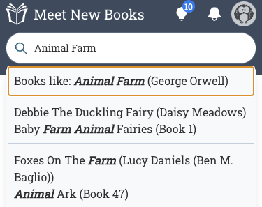 Looking for your next read? A great way to start is by entering the title of a book you already loved. For example, if you enjoyed reading 'Animal Farm', just type in the title, and we’ll show you similar books that other readers have loved. Give it a try